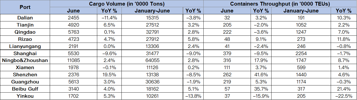 The port of Ningbo-Zhoushan enjoyed the second-best result, moving a total of 3.16 million TEU in June, up 17.9 per cent year-on-year.