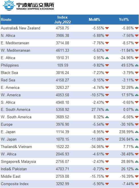 The average value of the Ningbo Container Freight index (NCFI) in July decreased by 5.9 per cent compared to last month, as shipping demand slumped on the Ningbo Zhoushan Port-West Costal of North America route.